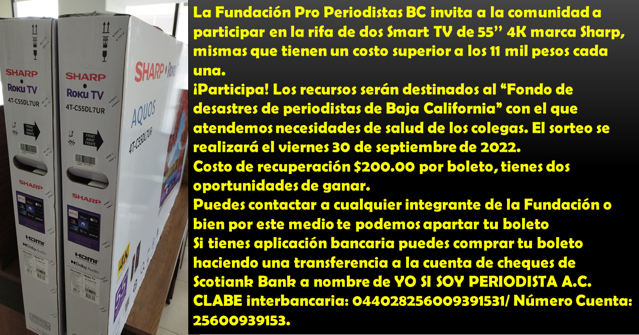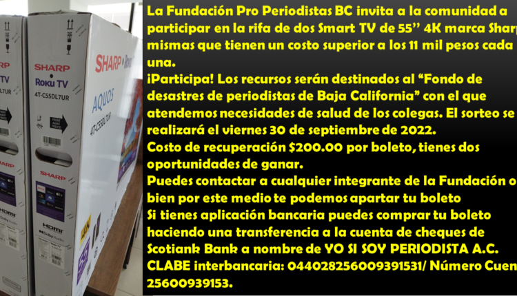 La Fundación Pro Periodistas BC invita a la comunidad a participar en la rifa de dos Smart TV de 55’’ 4K marca Sharp, mismas que tienen un costo superior a los 11 mil pesos cada una.